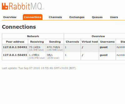 The previously mentioned management plugin is now in a state where it's worth looking at and testing. In order to make this easy, I've made a special once-only binary release just for the management plugin (in future we'll make binary releases of it just like the other plugins). Download all the .ez files from here and install them as described here, then let us know what you think. (Update 2010-09-22: Note that the plugins referenced in this blog post are for version 2.0.0 of RabbitMQ. We've now released 2.1.0 - for this and subsequent versions you can get the management plugin from here).